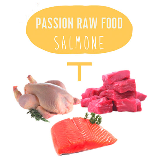 Alimento completo a base di Carne e Ossa di Pollame, Salmone, Carne di Manzo, Fegato di Manzo.